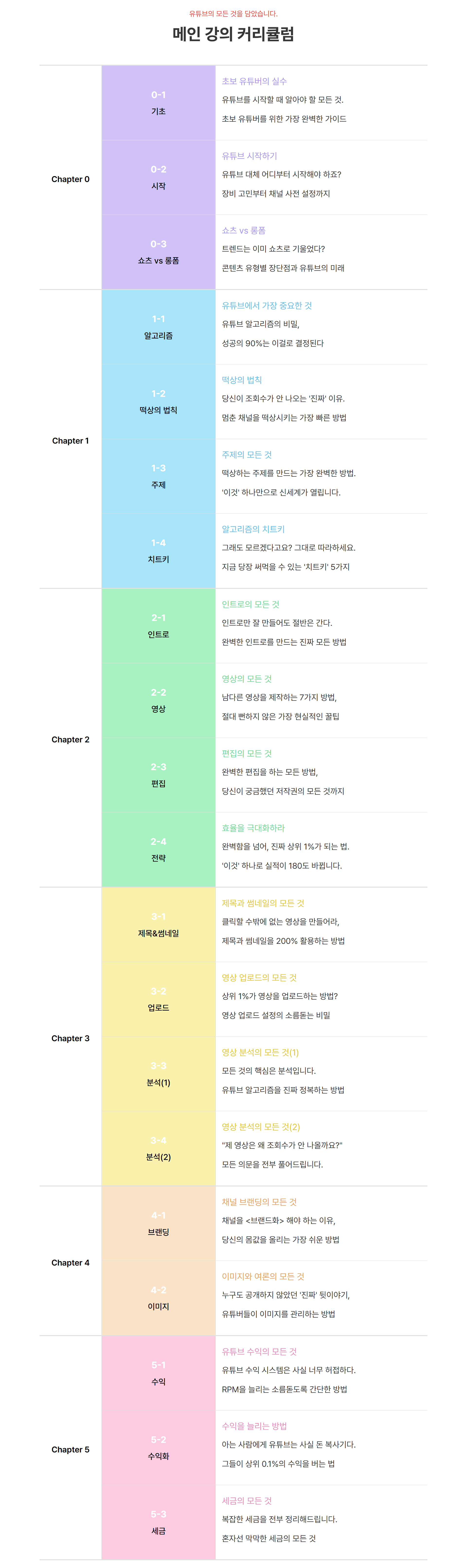 - 채널 운영 (영상 업로드시 지켜야 할 것들, 유튜버들이 하는 치명적인 실수들, 유튜브 채널 브랜딩 전략, 이미지 관리와 여론 조성법)